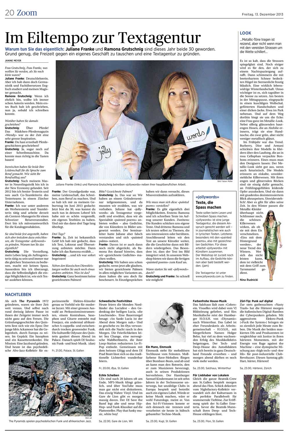 Als wir über ein eigenes Unternehmen nachdachten, stand vor allem eines im Vordergrund: die Freude am geschriebenen Wort. Und diese wollten wir gerne auch im Firmennamen wiederfinden. Als der Name jollywords gleich zu Beginn auf dem Tisch lag, fiel daher die Entscheidung nicht mehr schwer. Denn «jolly words» sind Wörter, die Spass machen und Emotionen wecken. Genau das wollten wir in Zukunft erreichen!
